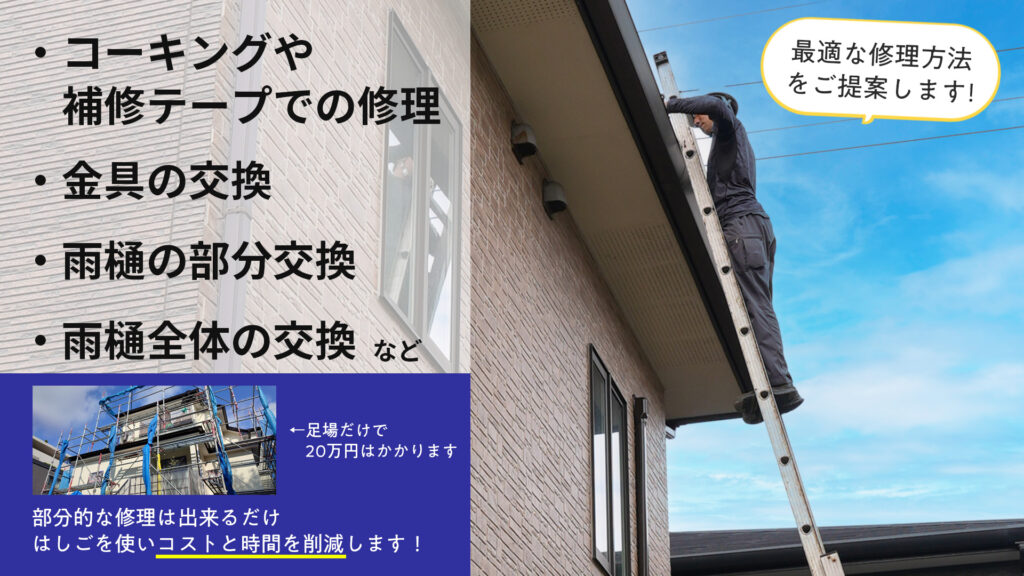 当社が提供している「雨樋修理プラン」は部分的な雨樋修理から古くなった雨樋の全交換まで対応した雨樋修理に特化したサービスとなっております。部分的な修理では出来るだけ足場を使わないように梯子や脚立、もしくは屋根に登らせてもらい修理を行います。足場を組むと1棟で20万円ほどかかってしまうため、出来るだけコストを抑えた修理方法をご提案しております。
