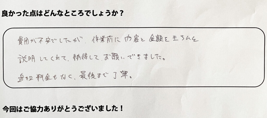 費用が不安でしたが、作業前に内容と金額をきちんと説明してくれて納得してお願いできました。追加料金もなく、最後まで丁寧。