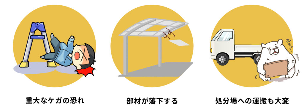 カーポートは部材が大きく重いため、脚立作業や高所作業中に転倒する・部材が落下する・手を挟むなど重大なケガにつながるリスクがあります。無理に外すと屋根材(ポリカ)が割れて飛散したり、フレームが倒れて車や外壁を傷つけたり、近隣に迷惑がかかることも。