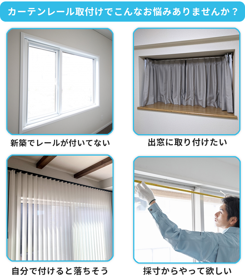 カーテンレールを取り付けたいと思っても、自分で作業するのは意外と大変です。水平がずれて見た目が不格好になったり、壁の材質が合わずしっかり固定できなかったりと、失敗の声も少なくありません。高い位置での作業は危険も伴い、忙しくて時間が取れない、工具を揃えるのが面倒、といった理由で取り付けを後回しにしてしまう方も多いのです。