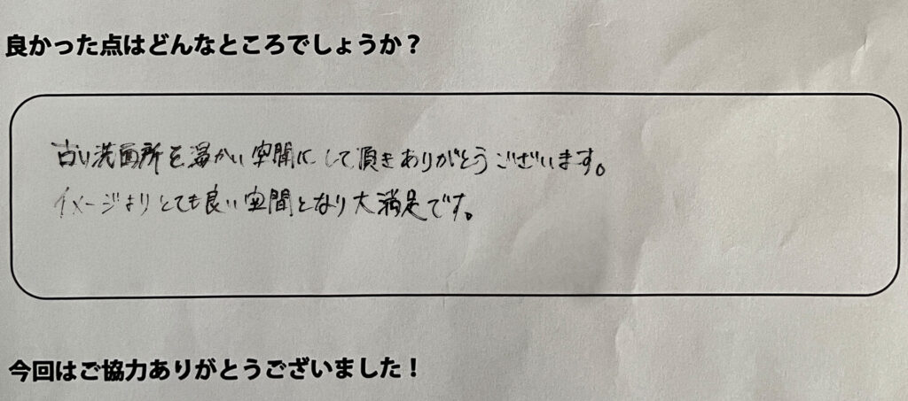 古い洗面台を温かい空間にして頂きありがとうございます。イメージよりとても良い空間となり大満足です