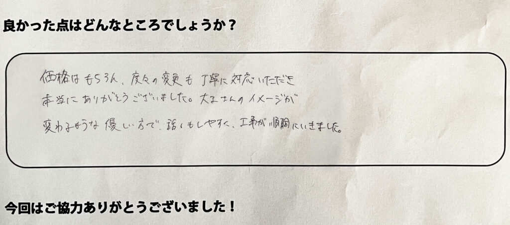 価格はもちろん、度々の変更も丁寧に対応いただき本当にありがとうございます。大工さんのイメージが変わるような優しい方で話しもしやすく工事が順調にいきました。