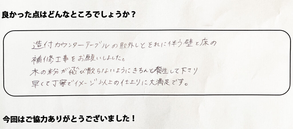 造作カウンターテーブルの取り外しとそれに伴う壁と床の補修工事をお願いしました。木の粉が飛び散らないようにきちんと養生して下さり早くて丁寧でイメージ以上の仕上がりに大満足です