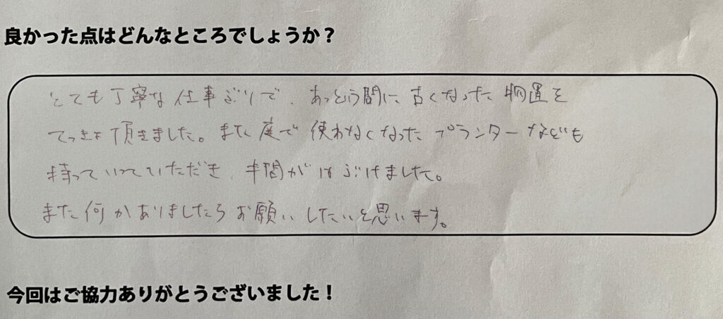 お客様からは「自分で処分できなくて困っていた」「こんなにキレイになるとは思っていなかった!」とお喜びの声を頂いてます!