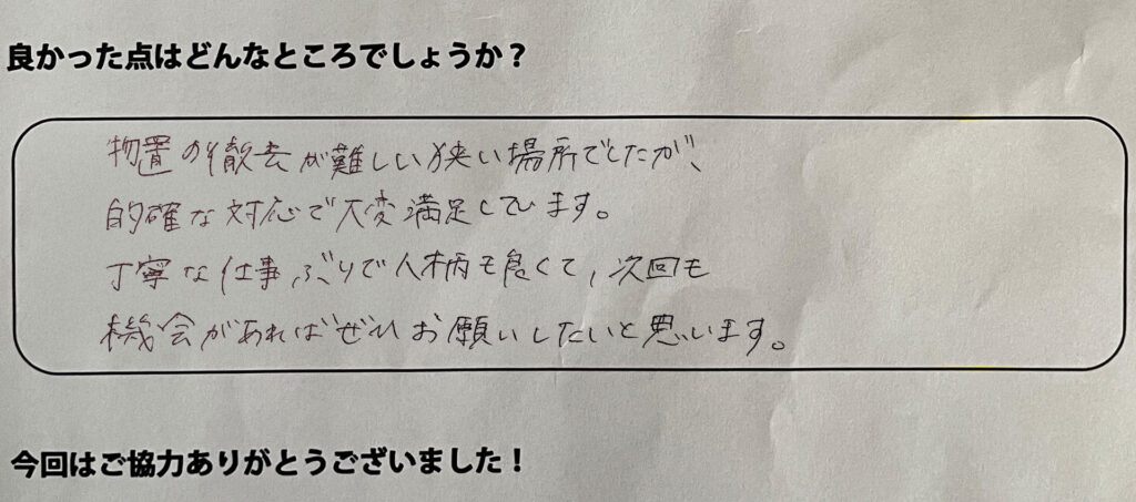 物置の撤去が難しい狭い場所でしたが、的確な対応で大変満足しています。丁寧な仕事ぶりで人柄も良くて、次回も機会があればお願いしたいと思います。