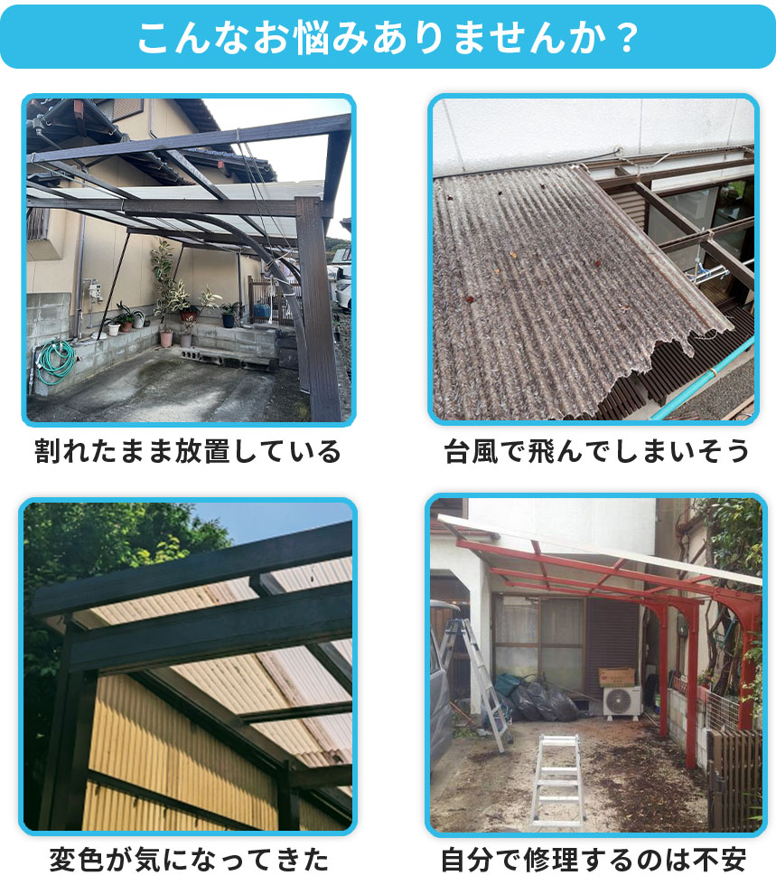 カーポートやベランダの波板は、古くなると雨漏りが起きたり、強風で飛ばされる危険があったりと、思わぬトラブルの原因になります。見た目が悪くなって気になるという声も多く、波板に関するお悩みを抱えている方はたくさんいらっしゃいます。